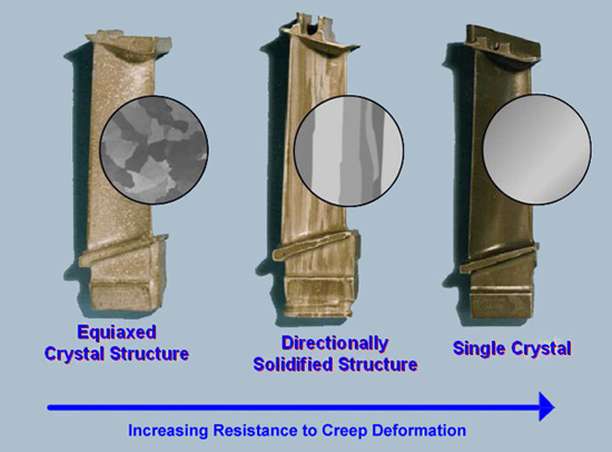 In this high temperature environment the life of the turbine blades is limited by creep, which is the continual and gradual extension of a material under constant load over time. Apart from distorting the physical dimensions and thereby reducing performance of the engine, the induced creep stresses exacerbate the centrifugal operating stresses and will therefore lead to premature failure of the material. Under ambient temperature creep is often only a factor for elastomers and other plastics, but at higher temperatures the effects become increasingly more pronounced for metals as well. A rule of thumb is that the blade life is halved (for a specific blade material and cooling technology) for each 10°C rise in temperature of the metal [1]. In the early days of turbine technology blades were forged but later cast for better high temperature performance. It was then found that by elongating the metal crystals along the direction of the span, creating so called directionally solidified blades, resulted in further improvements in creep performance. The standard technique for high-performance blades is to cast the blade out of a single crystal as shown in Figure 3 below. Metals may deform by separate crystals slipping along grain boundaries, such that removing the grain boundaries all together results in great improvements in resisting creep deformation.