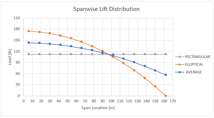 Again, the loads are applied to the quarter-chord position of the aircraft wings. Two different spanwise lift distributions are applied to the model for this comparison study. The first assumes an elliptical lift distribution. The second uses Schrenk’s Approximation to estimate a more accurate spanwise lift distribution. These two distributions are shown below along with a reference to a rectangular distribution.