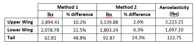 As the complexity increases with each of the methods discussed above, so does the accuracy of the results. However, not every stage of the design requires the same precision. Since this discussion focuses on how the analysis approach impacts the design of the aircraft, let us first compare the calculated loads for all three methods. Below is a table outlining the loads for each method and the percentage difference when compared to the aeroelasticity finite element model (the most accurate loads generation approach).