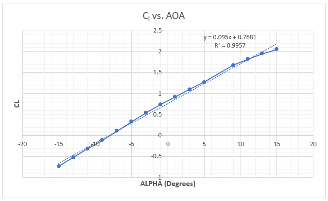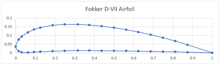 The first step in calculating the aerodynamic loads on the aircraft is to get the airfoil data. The Fokker D-VII uses a modified Goettigen GOE 418 airfoil for the upper wing. The airfoil data points (see the diagram below) were imported into XFOIL, a popular open-source 2D potential flow code, and the lift coefficients were extracted for various angles of attack (AOA). Using the XFOIL data, a plot relating the wing’s AOA to the lift coefficient ([latex] C_L [/latex]) is constructed. A trendline is added to the data to estimate the lift curve slope for the airfoil of [latex] C_{L_\alpha} = 0.095/^\circ [/latex] and the zero lift AOA is [latex]-8^\circ[/latex](the airfoil is angled down for no lift).