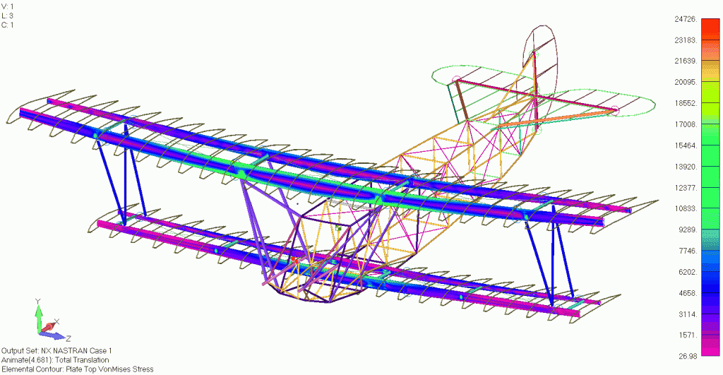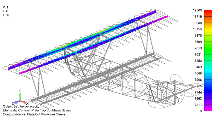 Our engineers had to develop a finite element model (FEM) and conduct the basic loads and dynamics analysis to define the load cases for the vehicle. Generating aerodynamic loads is relatively straight forward for aircraft with more conventional designs. Typically, a combination of 2D aerodynamic theory and corrections for wings with finite span are used to generate the loads in the early stages of the design phase. These loads are then applied to the structure at the quarter chord location of the wing. For the Fokker, this analysis is slightly more complicated because the biplane construction creates interference effects between the upper and lower wing which must be considered when determining the loads that act on the aircraft.