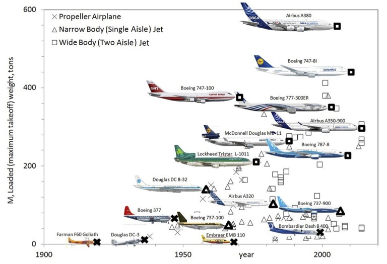 This overall trend is depicted nicely in Figure 1 which shows the size of new airplane models against the year they were put into service. It is evident that the biggest planes of one generation are surpassed by even bigger planes in the next. Based on economical arguments it can be assumed that each model introduced was in some way more efficient in terms of passenger capacity, speed, range, i.e. cost-effectiveness than the previous generation of the same size. Thus, in terms of the constructal law the spreading of flow is optimised and this appears to be closely matched with the airplane size and mass. Similarly, Figure 2 shows that both birds and aircraft evolve in the same way in that the bigger fly faster. Thus, the evolution of natural and technological designs seems to have converged on the same scaling rules. This convergent design is also evident in the number of new designs that appear over time. At the start of flight the skies were dominated by swarms of insects of very different design. These were followed by a smaller number of more specialised bird species and today by even fewer “aircraft species”. Combining these two ideas of size and number, it seems that the new are few and large, whereas the old are many and small.