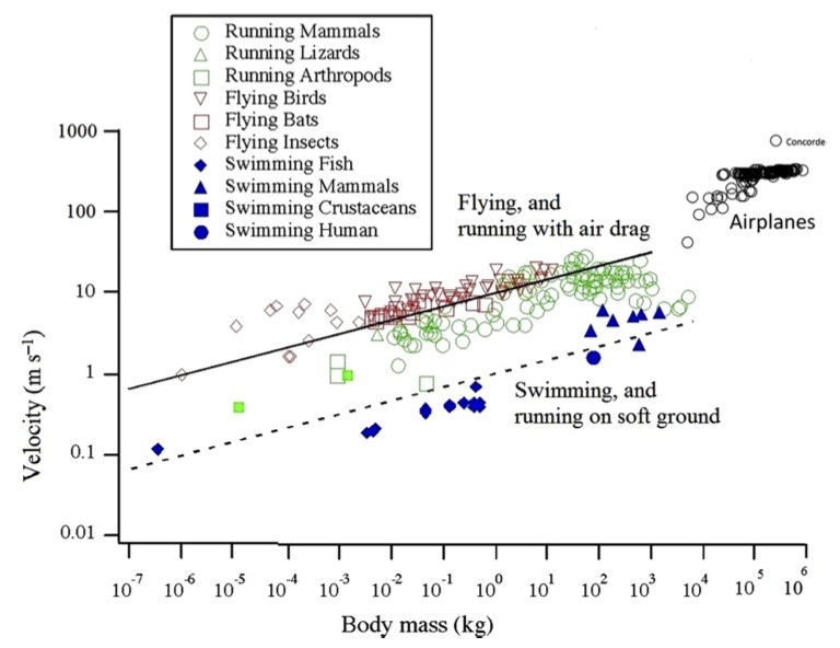 Figure 1. Evolution of airplane mass versus time [2]Figure 2. Evolution of animal flight speed versus body mass [2]