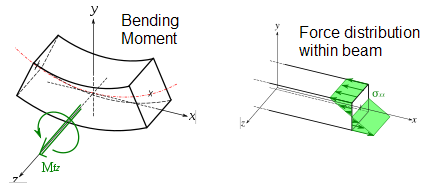Various structures on an aeroplane are subjected to bending loads. Essentially the bending of a beam or a plate, by say some sort of pressure loading over its surface, is equivalent to grabbing the edges and applying a moment or rotation. Under pure bending Engineer’s bending theory assumes that the structure resists this moment by a linear variation of stress through its thickness. Thus, the maximum stresses occur at the top and bottom surfaces, one being compressive and the other tensile, while the stress at the middle of the beam thickness is zero. This unstressed location is called the neutral axis. For pure bending the neutral axis is always located at the centroid of the cross-section (the mid-plane for a rectangular cross-section) and can be calculated using the integral expression for the first moment of area. Therefore we can see that that the structure balances the externally applied bending moment by an internal force couple of equal magnitude where the fulcrum of the couple is the location of the neutral axis.