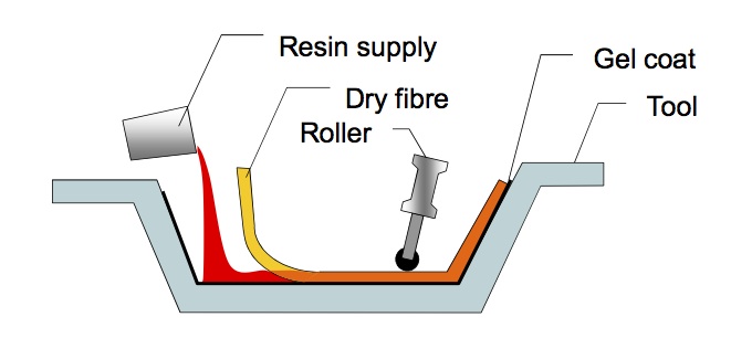 This is the oldest and most primitive manufacturing process but also the most widely used around the world. In contact moulding resin is manually applied to a dry reinforcement placed onto a tool surface and can be compared to glueing wall paper with a brush. The tool and fabric are then enclosed by a vacuum bag and the air under the bag removed in order to cure the laminate under atmospheric pressure. However, since the applied pressure is relatively low and cure typically occurs at room temperature the volume fraction of reinforcement is limited to the natural packing density. Furthermore, the quality is totally dependent on the skill of the workforce and due to the difficulty in reliably guaranteeing high-quality laminates it is almost impossible to qualify contact moulded structural components for commercial aircraft. Finally, due to the limited external pressure voidage is difficult to control, which has a great effect on the variability in the thickness of laminates.