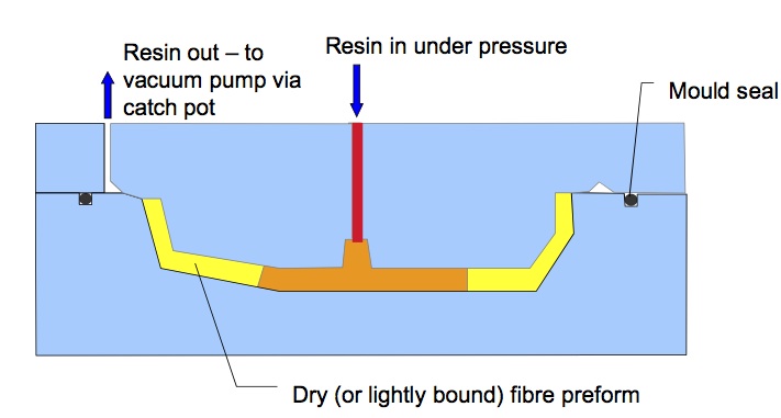 A major advantage of RTM is the use of low added value materials (dry fibres and low viscosity resins) which do not have to be stored in freezers, thus driving down material and handling costs. The major advantages of RTM however lie within their geometrical and property flexibility. RTM can be used with UD stitched cloths, woven fabrics and 3D fabrics, and the resin injection can be varied to control the volume fraction and therefore the stiffness and strength of the component. Furthermore, small components with very fine details are manufactured on rigid metal tooling while larger components can be produced on flexible moulds. Finally, with a closely controlled process it is possible to create net-shape mouldings with minimal finishing requirements. However, all this comes at the cost at a slightly trickier production technique. In order to guarantee high-quality components the resin injection and resin flow has to be closely controlled such that all of the reinforcement is equally wetted-out. This requires quite advanced fluid dynamics simulations and extensive testing in order to come up with a mould shape that allows even resin flow to all parts of the component.