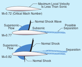 As the aircraft airspeed approaches the speed of sound, small pockets of supersonic flow develop on the suction surface of the airfoil as the airflow accelerates over the curved profile. For thermodynamic reasons these pockets of supersonic flow terminate in normal shock waves and the ensuing increase in pressure exacerbates the adverse pressure gradient on the suction surface. Ultimately, this leads to premature boundary layer separation and thereby decreases lift and increases drag (see figure below). John Stack was the first person to capture this phenomenon on film and paved the way for supersonic flight in the years to come.